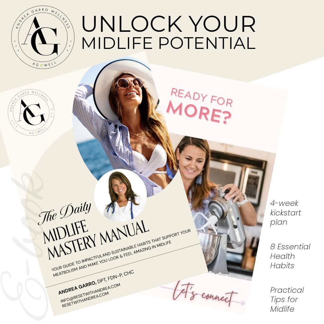 This comprehensive guide, created by Dr. Andrea Garro, a Doctor of Physical Therapy and Functional Medicine Practitioner, is packed with impactful and sustainable habits tailored to support your metabolism, balance hormones, and help you look and feel amazing in midlife. From daily routines to long-term lifestyle changes, this handbook is your roadmap to thriving during this transformative stage of life.